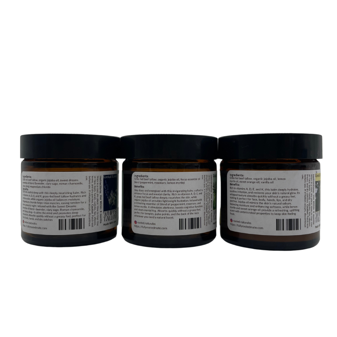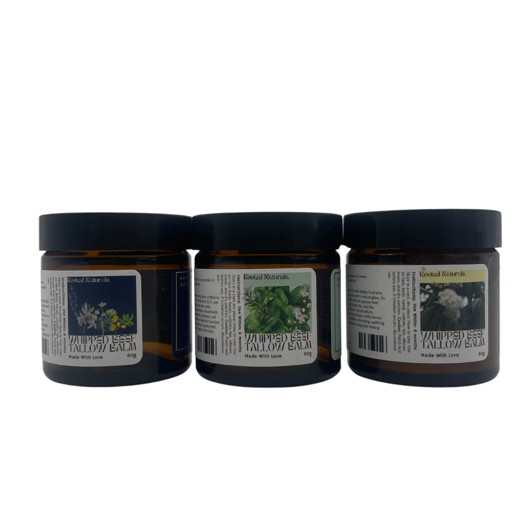 Our Whipped Beef Tallow Balm Trio brings together three uniquely crafted blends—Lemon Myrtle, Sweet Dreams, and Minty Focus—designed to hydrate, protect, and elevate your skin and senses. Made with 100% grass-fed beef tallow, organic jojoba oil, and expertly selected essential oils, this bundle delivers the perfect balance of nourishment, relaxation, and invigoration.
